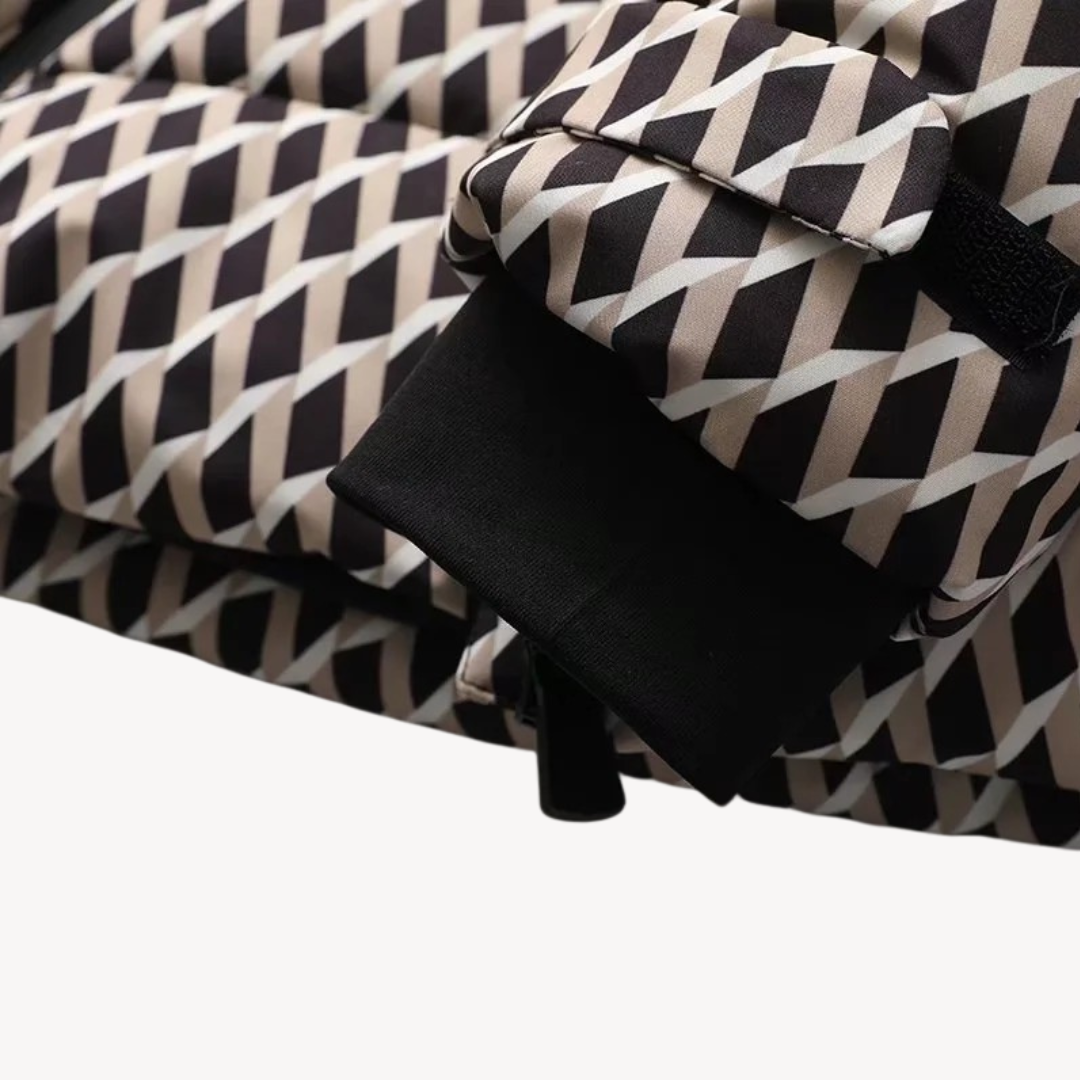 Upgrade your winter wardrobe with this women's stylish belted puffer jacket featuring a chic hood and a bold, eye-catching pattern. Designed for the fashion-forward woman, this jacket combines modern style with practical functionality, ensuring you stay warm and look fabulous throughout the colder months.